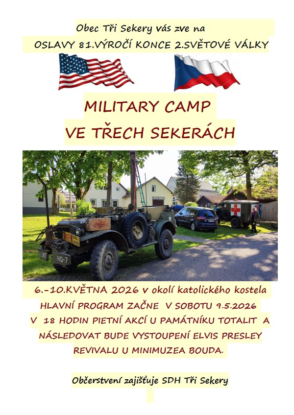 Obec Tři Sekery srdečně zve na oslavy 81. výročí konce 2. světové války, které se uskuteční od 6. do 10. května 2026. Hlavní program začne v sobotu 9. května v 18 hodin pietní akcí u památníku obětem totalit. Následovat bude vystoupení revivalu Elvise Presleyho u Minimuzea Bouda. Během Military Campu si návštěvníci budou moci prohlédnout historickou techniku a zúčastnit se různých aktivit. Občerstvení zajišťuje SDH Tři Sekery.