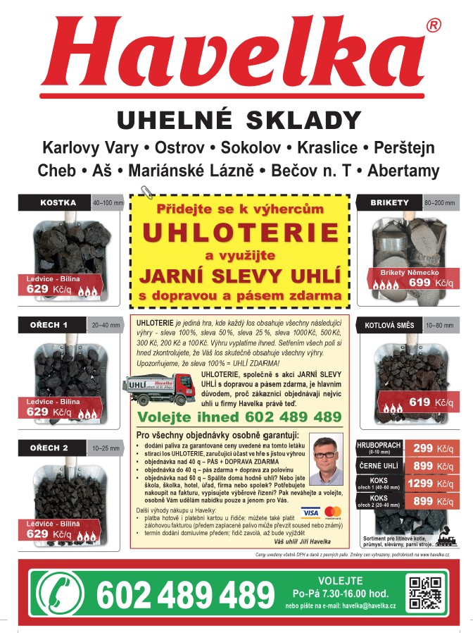Firma Havelka nabízí jarní slevy na uhlí s dopravou a pásem zdarma. Každý zákazník má možnost zapojit se do hry UHLOTERIE, která zaručuje výhry, včetně uhlí zdarma. V rámci akce jsou k dispozici různé druhy uhlí, včetně briket a hruboprachu, za výhodné ceny. Všechny objednávky nad 40 q obsahují dopravu zdarma. Pro více informací a objednávky můžete kontaktovat Jiřího Havelku.
