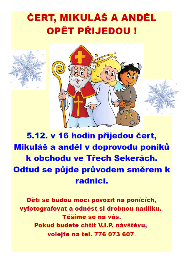 Srdečně zveme všechny na setkání s Čertem, Mikulášem a andělem, kteří opět navštíví naši obec. Tato akce se uskuteční 5. prosince 2025 v 16 hodin u obchodu ve Třech Sekerách. Po příjezdu v doprovodu poníků se vydáme společně v průvodu směrem k radnici. Děti budou mít možnost povozit se na ponících, vyfotografovat se a odnést si malou nadílku. Přijďte si užít tuto výjimečnou příležitost a oslavit příchod Mikuláše s námi.