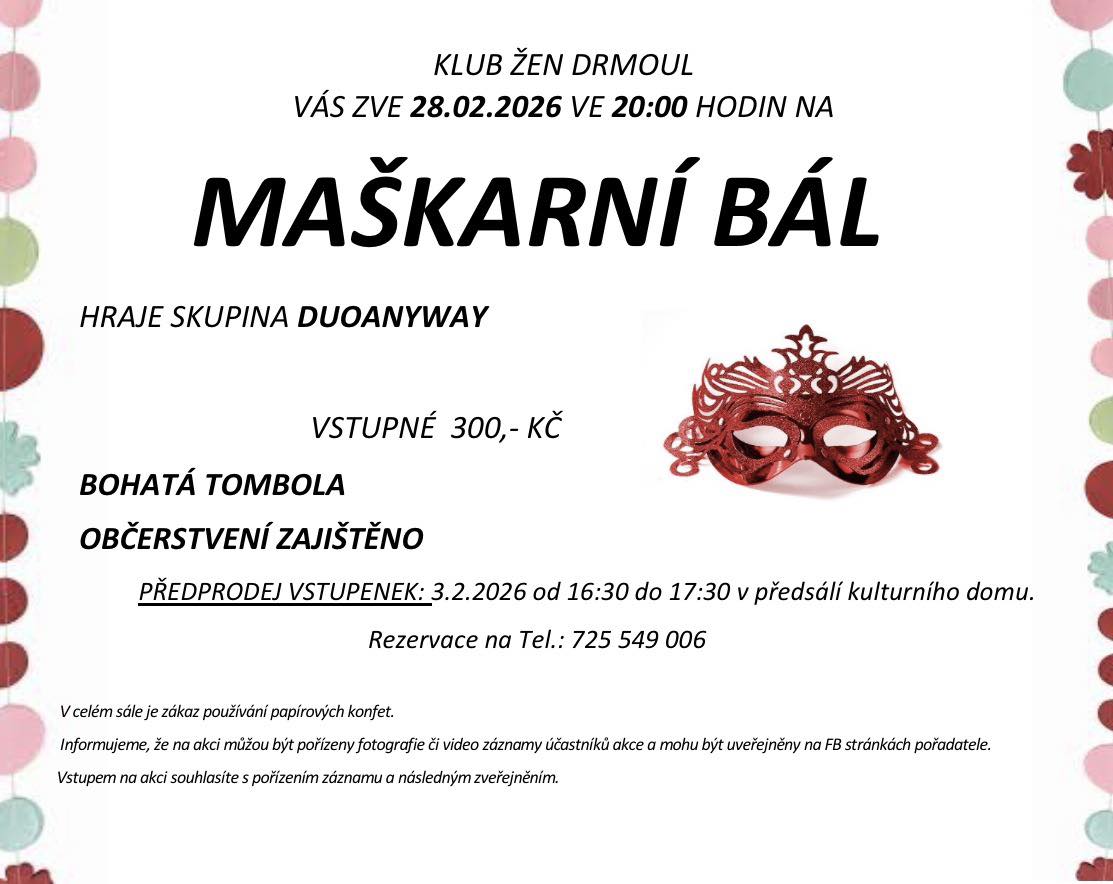 Klub žen Drmoul vás srdečně zve na maškarní bál, který se uskuteční 28. února 2026 ve 20:00 hodin. K tanci a poslechu zahraje skupina Duoanyway. Vstupné na tuto akci je 300 Kč. Pro návštěvníky je připraveno bohaté občerstvení a tombola. V sále je zakázáno používat papírové konfety. Rezervace je možná na telefonním čísle 725 549 006. Upozorňujeme, že pořízené fotografie a videa mohou být zveřejněny na Facebookových stránkách pořadatele. Vstupem na akci souhlasíte s pořízením záznamu.