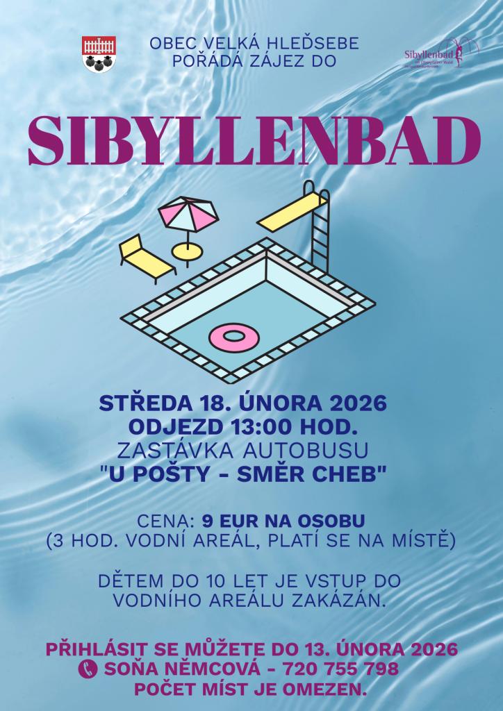 Obec Velká Hleďsebe pořádá zájezd do vodního areálu Sibyllenbad. Odjezd je naplánován na středu 18. února 2026 v 13:00 hodin. Autobus zastaví na zastávce „U pošty - směr Cheb“. Dětem do 10 let je vstup do vodního areálu zakázán. Počet míst je omezen, proto doporučujeme přihlásit se co nejdříve.